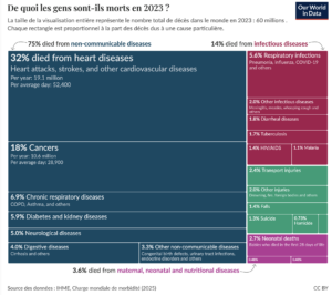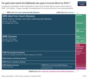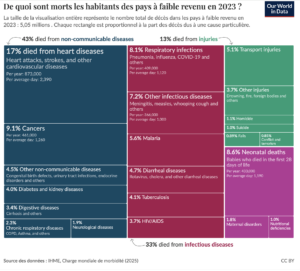 De quoi meure-t-on dans le monde ? 16/04/2026 Béatrice de Reynal 107 visites En moyenne, 75 % des décès sont dus aux maladies non transmissibles : 32 % des maladies cardio-vasculaires et 18 % de cancers. Seulement 14 % des décès sont liés aux infections. Mais ceci cache une forte variabilité selon que le pays soit riche ou défavorisé. Pour les pays défavorisés, les infections pernnent le lead, forcément, ainsi que les mortalités périnatales. En comparant aux pays à haute revenus, on voit que 88 % des décès sont causés par nos abus (alimentaires, surpoids et obésité, diabètes et maladies dégénératives. Ainsi, on se suicide davantage dans les pays riches au pauvres. Si on partageait les richesses, on partagerait aussi les risques … Share Post Share